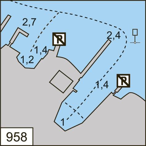 Kiinnittyminen: Aisa, poiju, kylkikiinnitys. Syvyys 2,5 m.