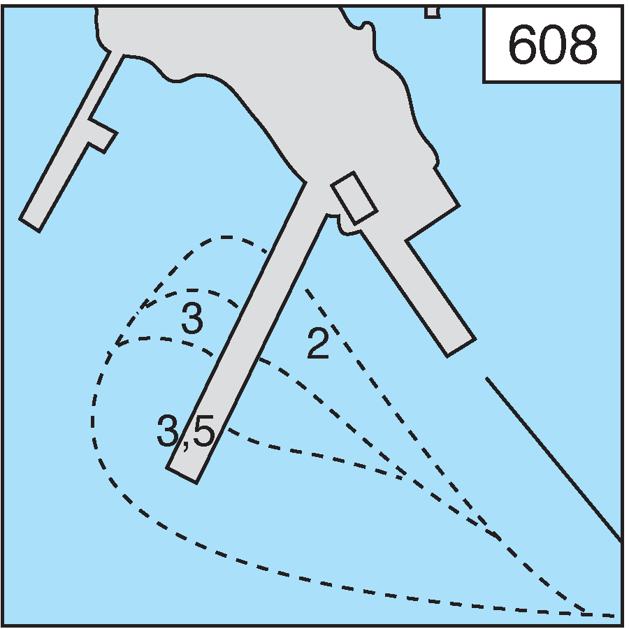 Kiinnittyminen: Poiju. Kiinnittyminen laituriin yhteyslaiturin länsipuolella tai yhteyslaituriin siten, ettei yhteysliikennettä häiritä. Syvyys 3,5 m.